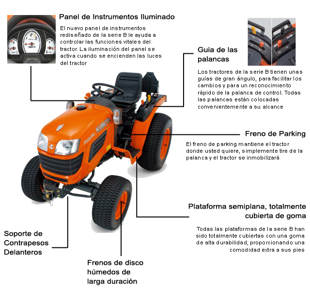 Cuando usted lleva trabajando muchas horas, la comodidad es uno de los factores más importantes. Más dotaciones ergonómicas y funcionales, incluyendo una plataforma totalmente cubierta de goma, hacen de los tractores Kubota de la Serie B unos vehículos cómodos y más fáciles de utilizar.